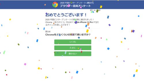 先日ネットを見ていたら、急にChrome(クローム)アンケート画面に。アンケート参加者には「iPhone 11 Pro」が当たるチャンスがあるとのこと。 そして、アンケートに答えたその先には…